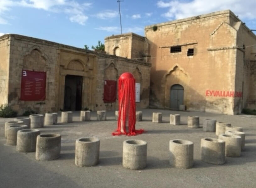 Child BrideThis sculpture is a part of an installation created for 3. Mardin Biennial supporting #ChildNOTBride campaign.Made of fabric ribbons, iron and paint, its dimentions are 60 x 60 x h:300cm.