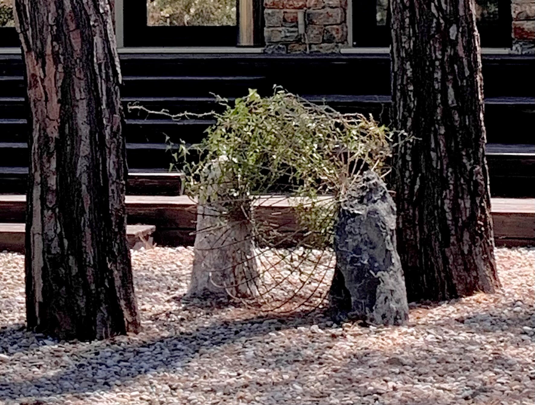 Nature taking overThis sculpture is a site specific installation made of iron, redpine trees, local rocks and Mediterranean ivy (smilax aspera). Its dimentions are 250 x 250 x 2500 cm.